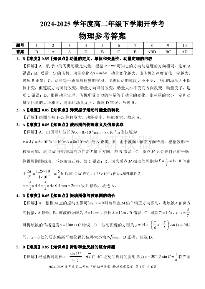 梧州2025年春季开学考高二物理答案.pdf