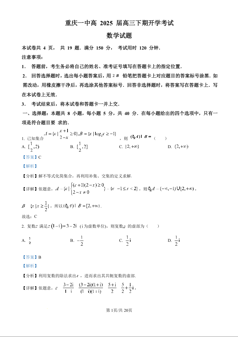 重庆一中2025届2月高考适应性月考卷 数学答案.docx