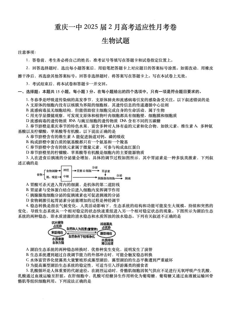 重庆一中2025届2月高考适应性月考卷 生物.pdf
