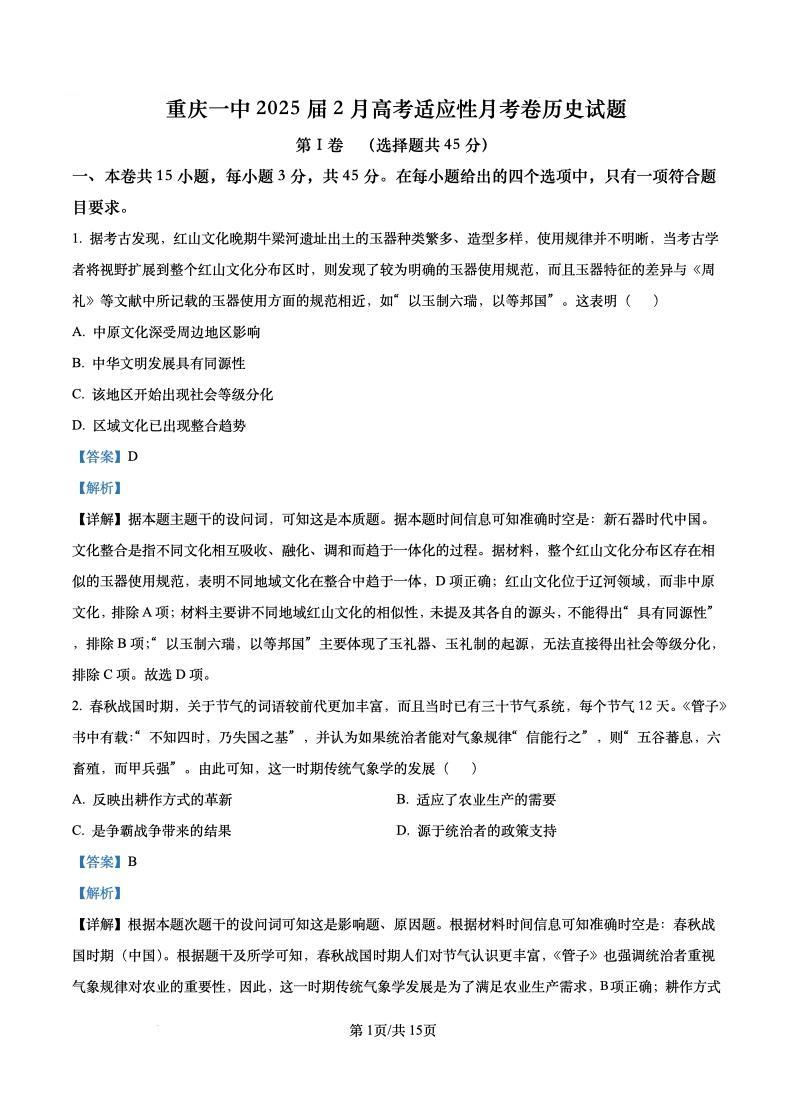重庆一中2025届2月高考适应性月考卷 历史答案.pdf