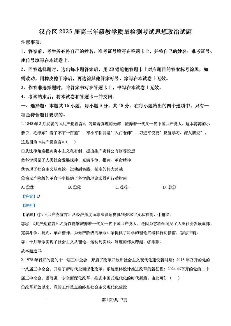 陕西省汉中市汉台区2025届高三年级教学质量检测 政治答案.pdf