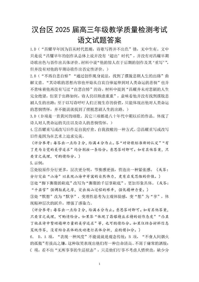 陕西省汉中市汉台区2025届高三年级教学质量检测 语文答案.pdf
