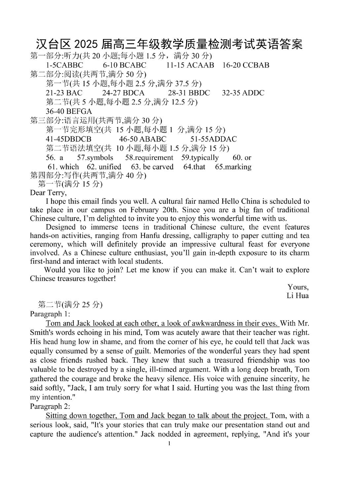陕西省汉中市汉台区2025届高三年级教学质量检测 英语答案.pdf