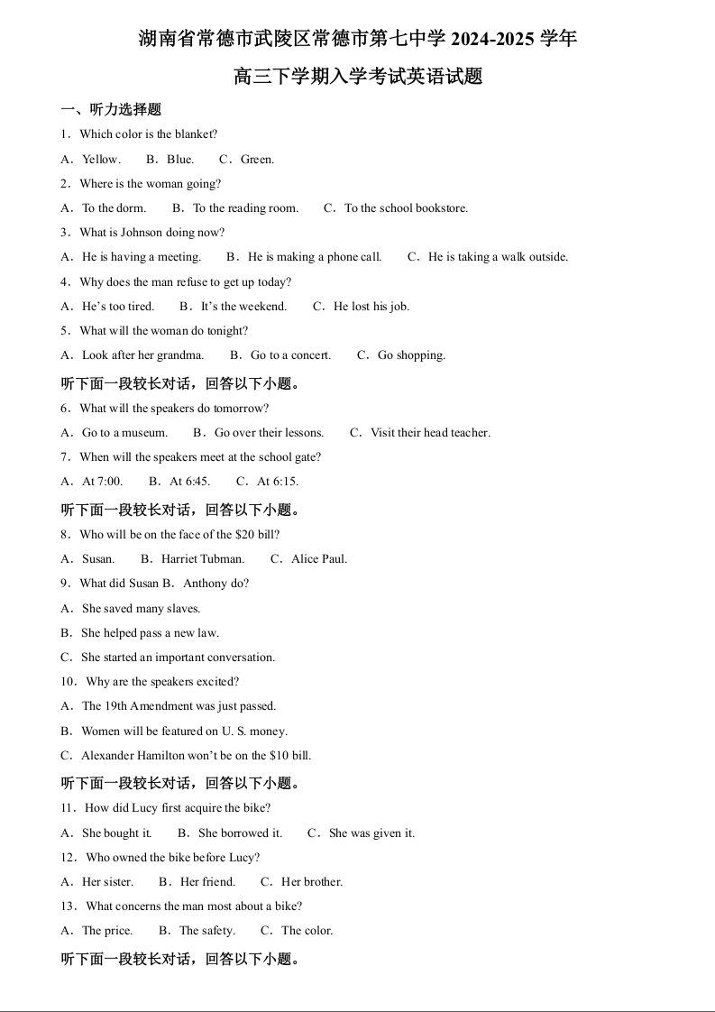 湖南省常德市第七中学2025届高三下学期开学考试 英语.docx