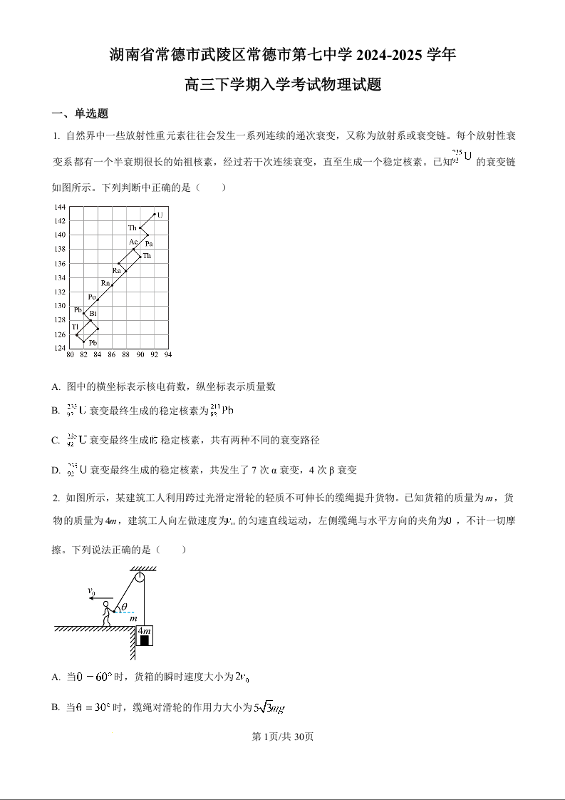 湖南省常德市第七中学2025届高三下学期开学考试 物理.docx