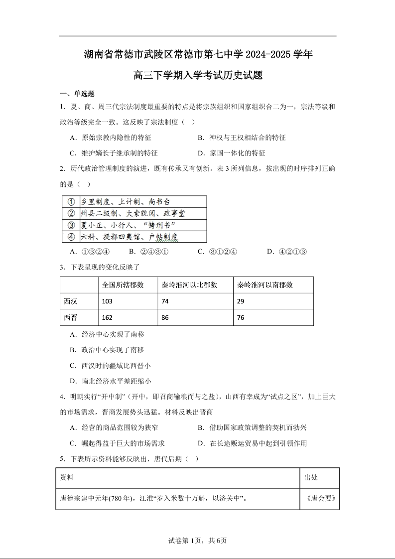 湖南省常德市第七中学2025届高三下学期开学考试 历史.docx