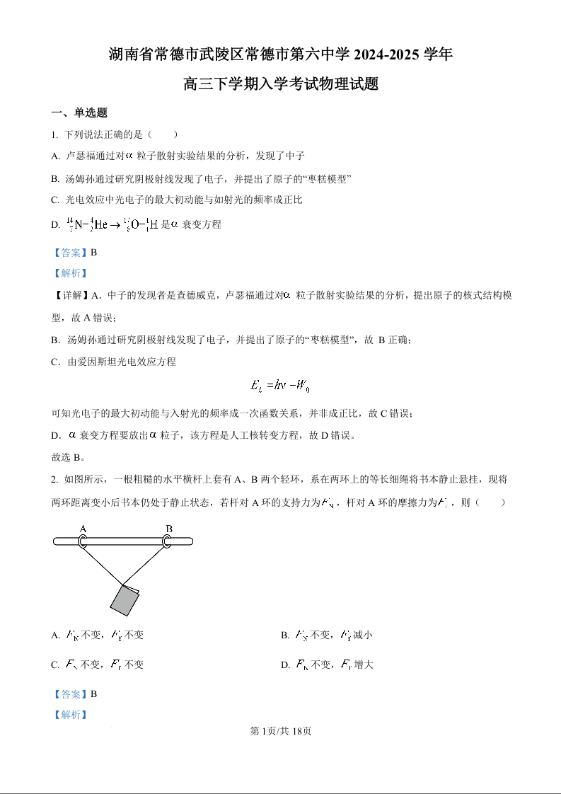 湖南省常德市第六中学2025届高三下学期开学考试 物理答案.docx