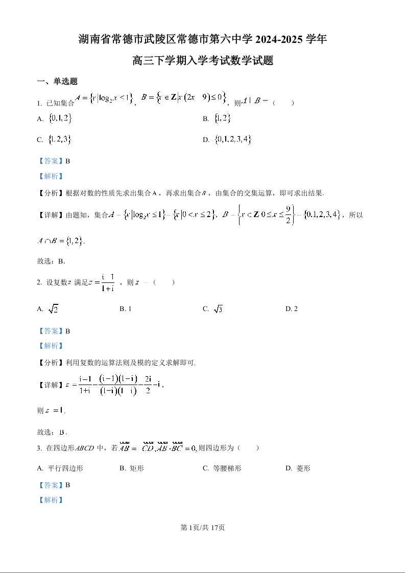 湖南省常德市第六中学2025届高三下学期开学考试 数学答案.docx