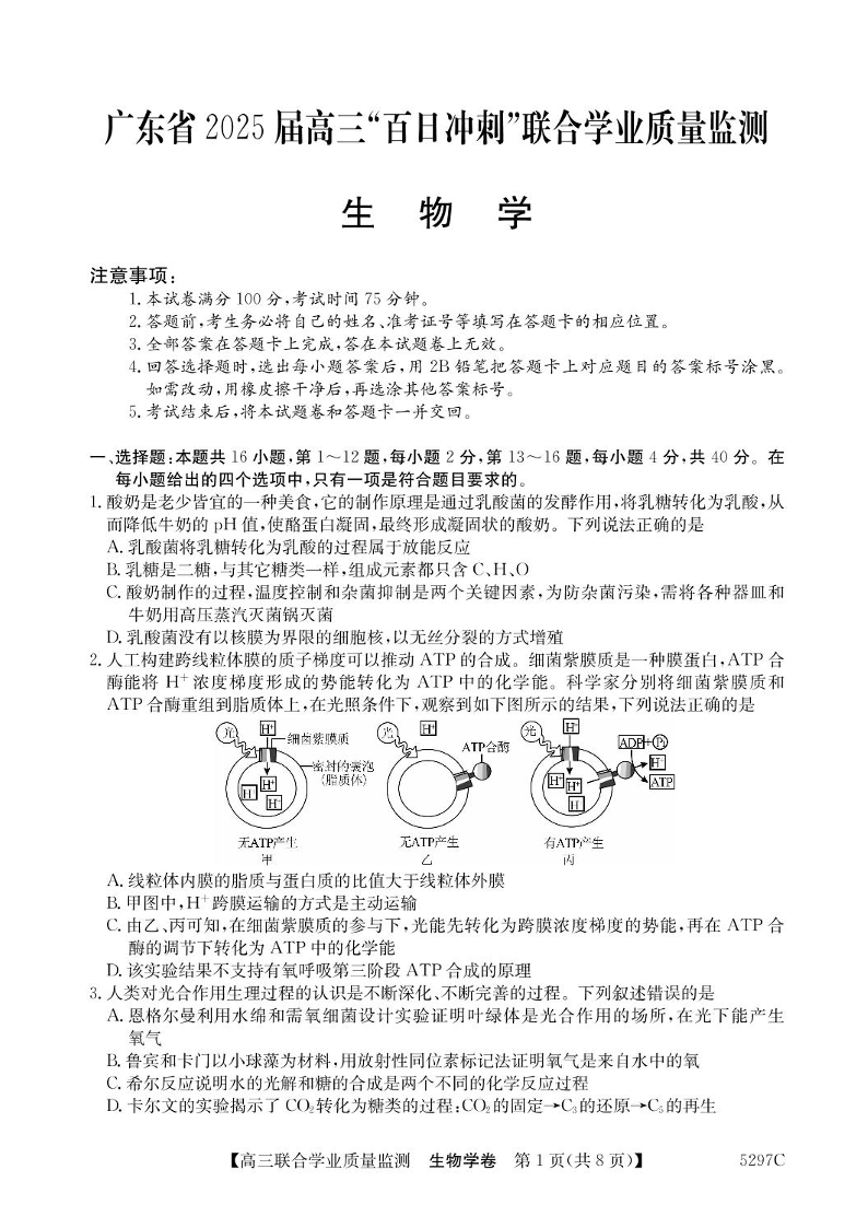 广东省2025届高三“百日冲刺”联合学业质量监测 生物(含答案).pdf