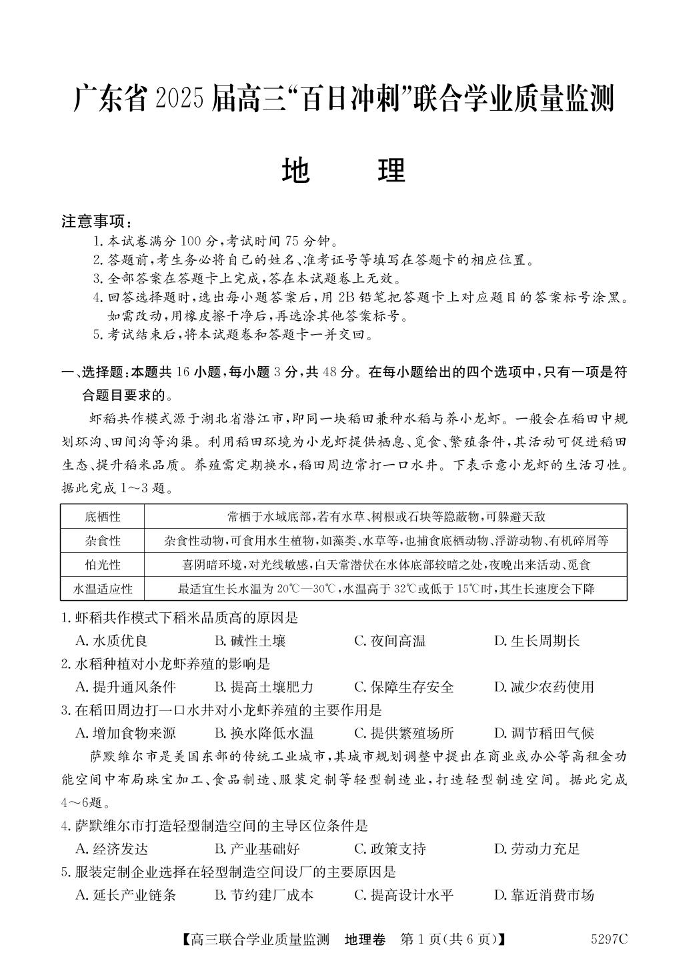 广东省2025届高三“百日冲刺”联合学业质量监测 地理(含答案).pdf