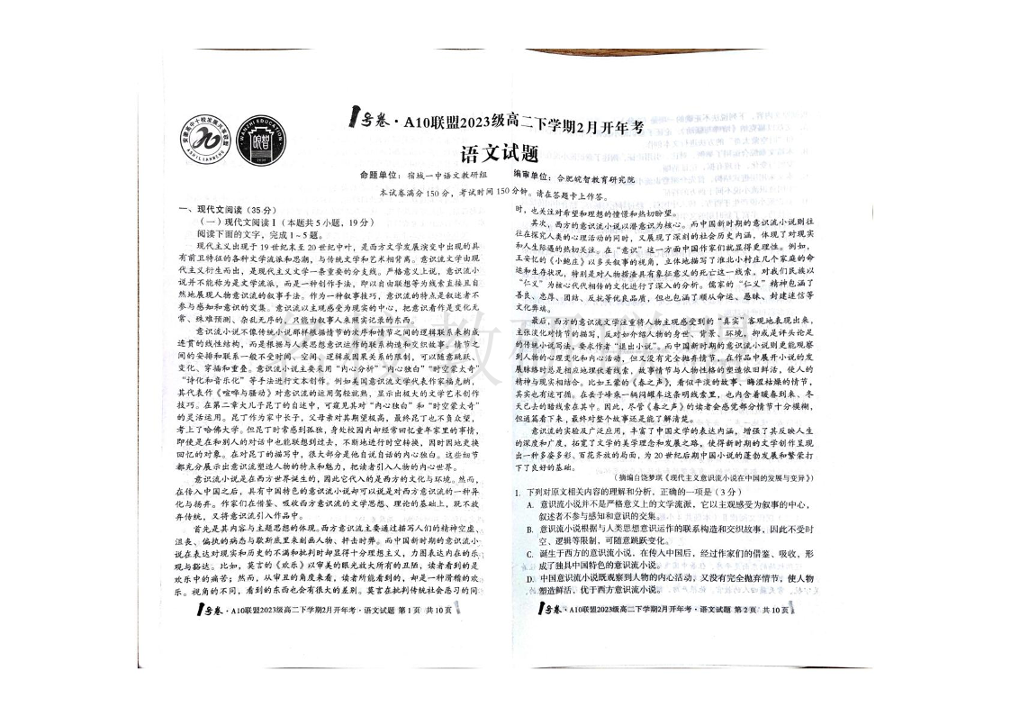 安徽省A10联盟2024-2025学年高二下学期2月开学考试 语文(含答案).pdf