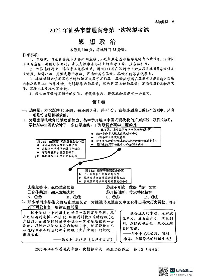 广东省2025年汕头市普通高考第一次模拟考试 政治.pdf