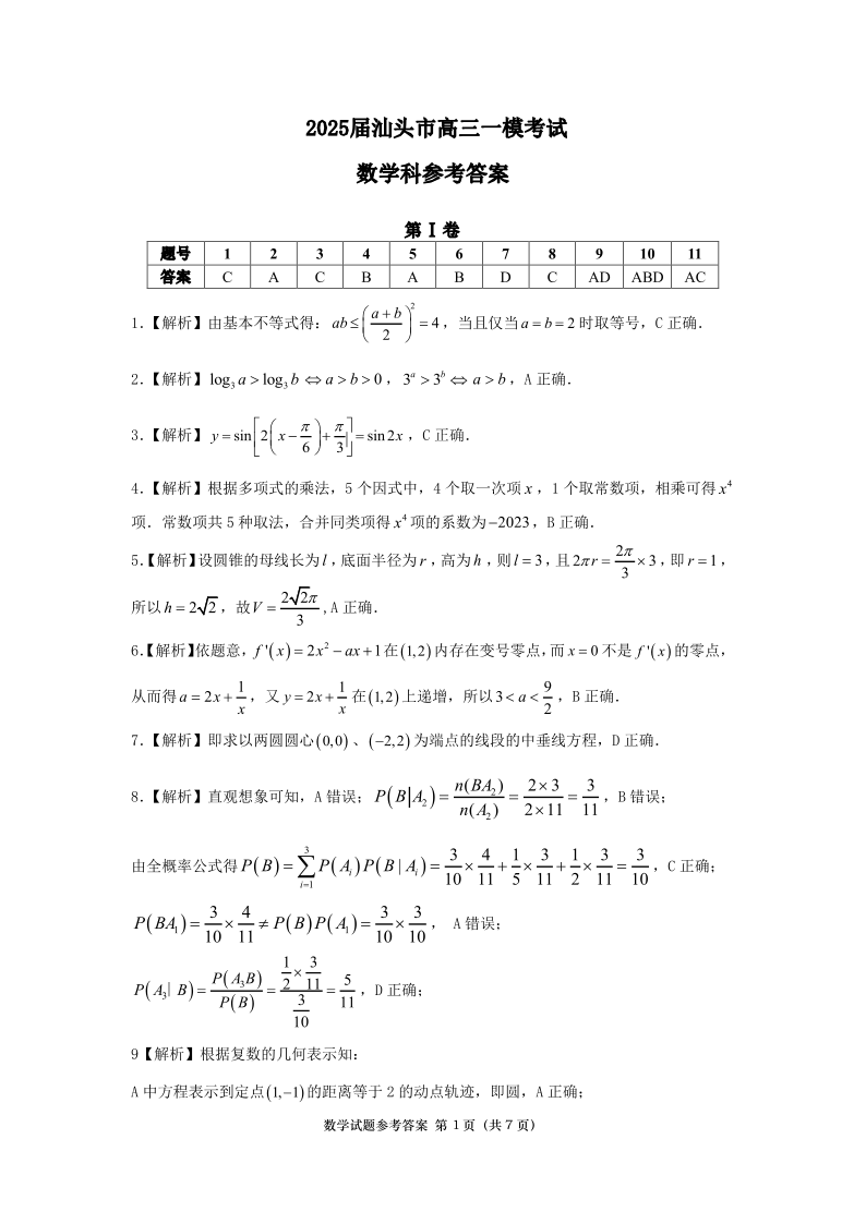 广东省2025年汕头市普通高考第一次模拟考试 数学答案.pdf