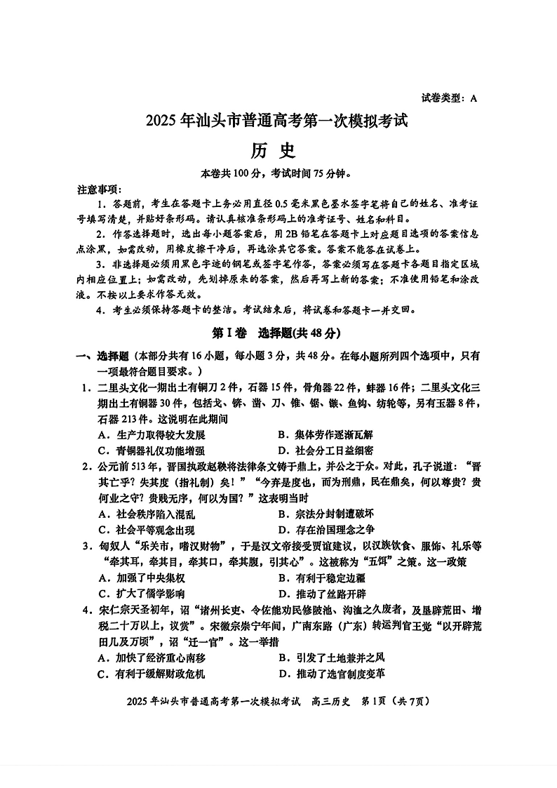 广东省2025年汕头市普通高考第一次模拟考试 历史.pdf