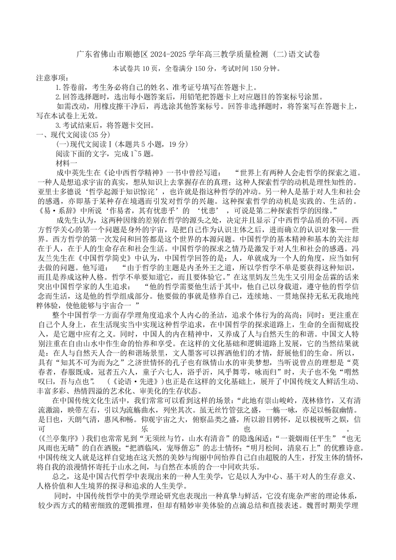 广东省佛山市顺德区2024-2025学年高三教学质量检测(二)语文(含答案).docx