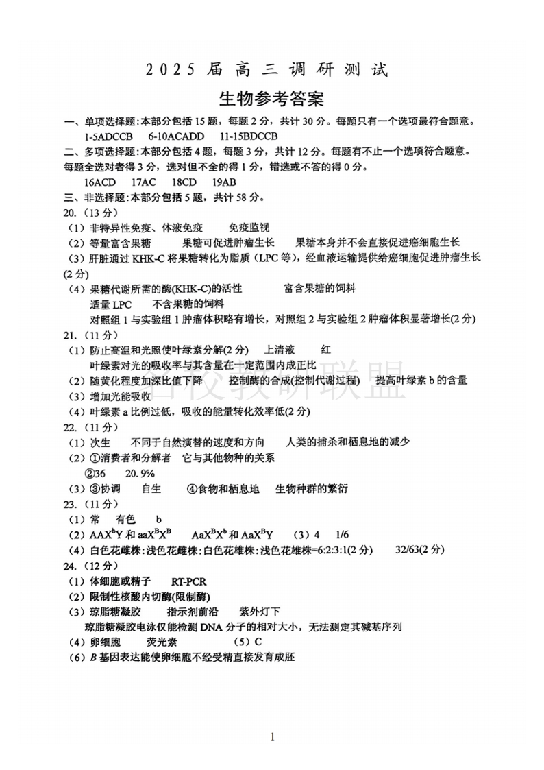 泰州市2025届第一次调研测试 生物答案.pdf