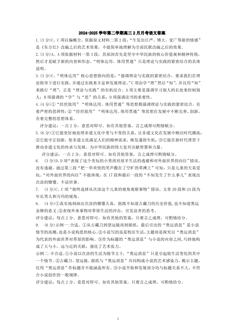 南昌十九中2024-2025学年第二学期2月月考 高三语文答案.pdf