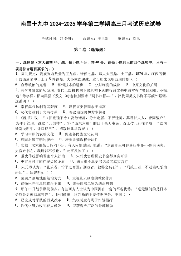 南昌十九中2024-2025学年第二学期2月月考 高三历史.docx