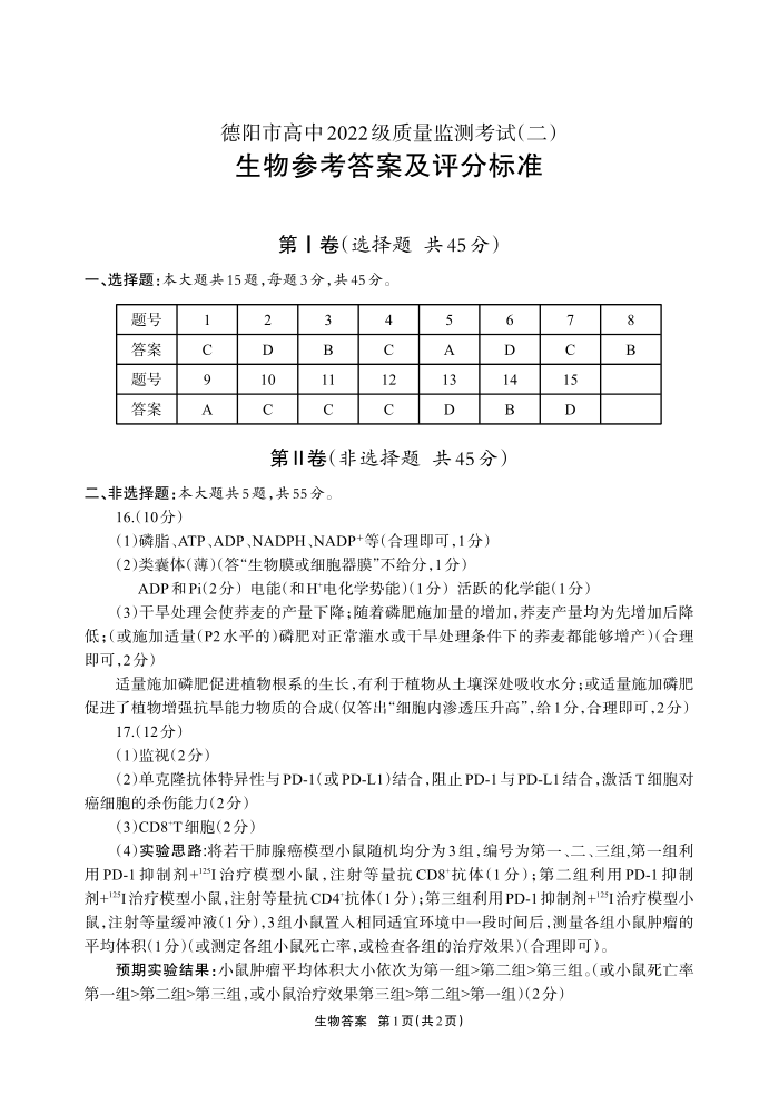 德阳市高中2022级质量监测考试(二)生物答案.pdf