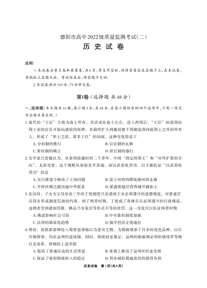 德阳市高中2022级质量监测考试(二)历史.pdf