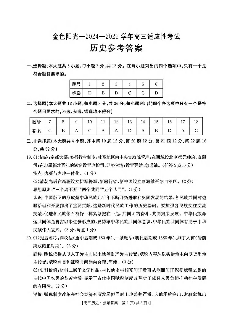 浙江金色阳光联盟2024-2025学年高三适应性考试 历史答案.pdf