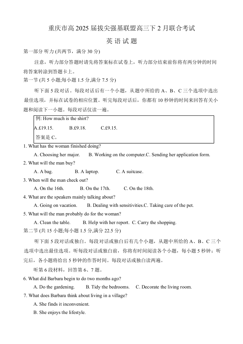 重庆市高2025届拔尖强基联盟高三下2月联合考试 英语.docx