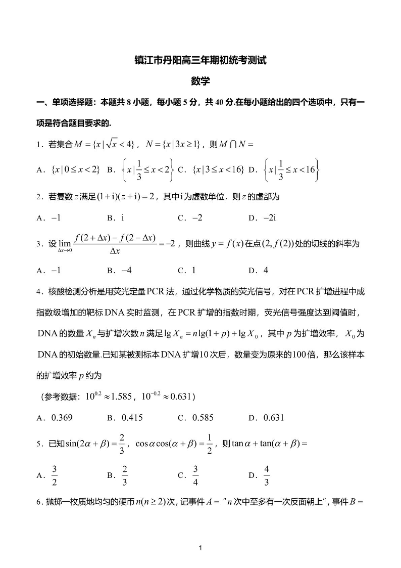 江苏省镇江市2025届高三下学期期初质量监测 数学(含答案).pdf