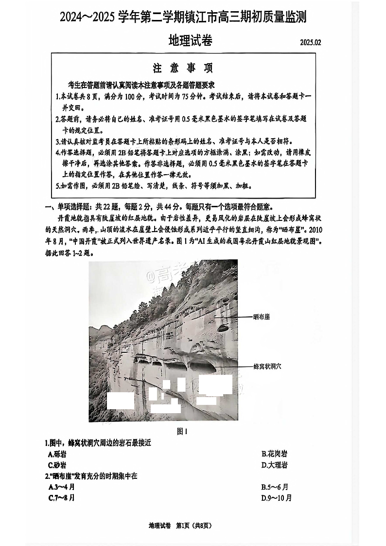 江苏省镇江市2025届高三下学期期初质量监测 地理(含答案).pdf