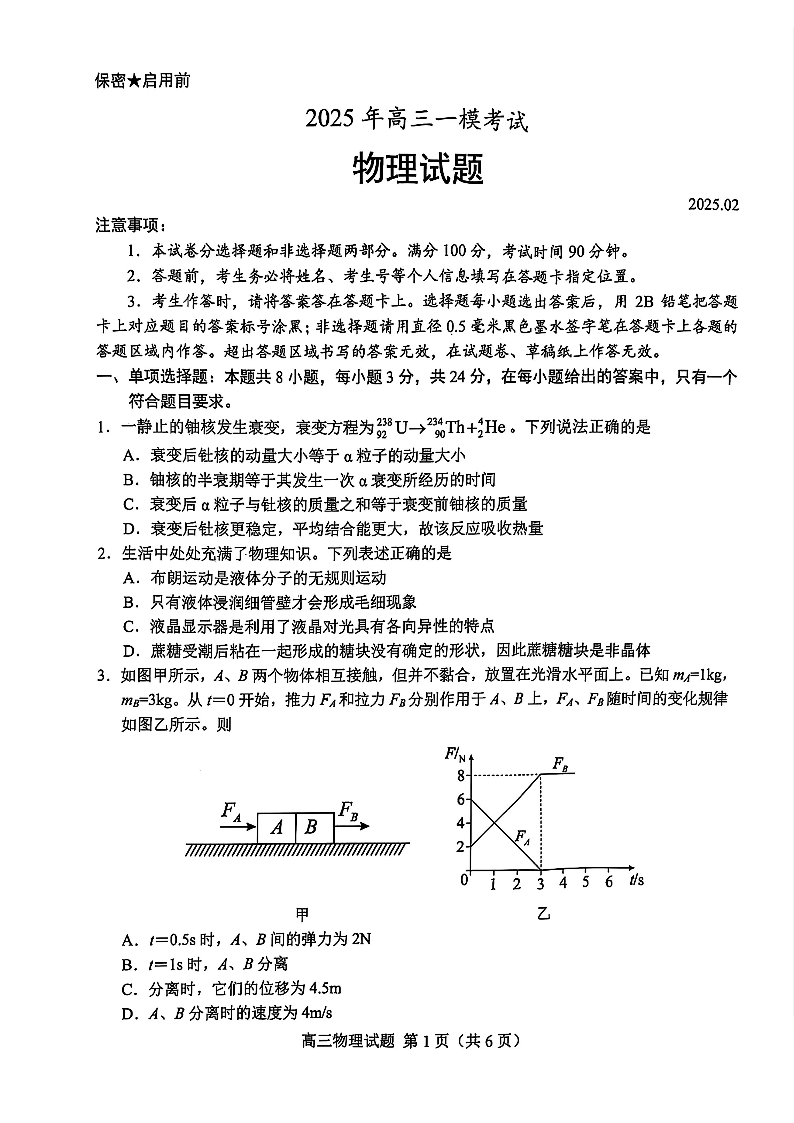 山东省菏泽市2025年高三一模考试 物理.pdf