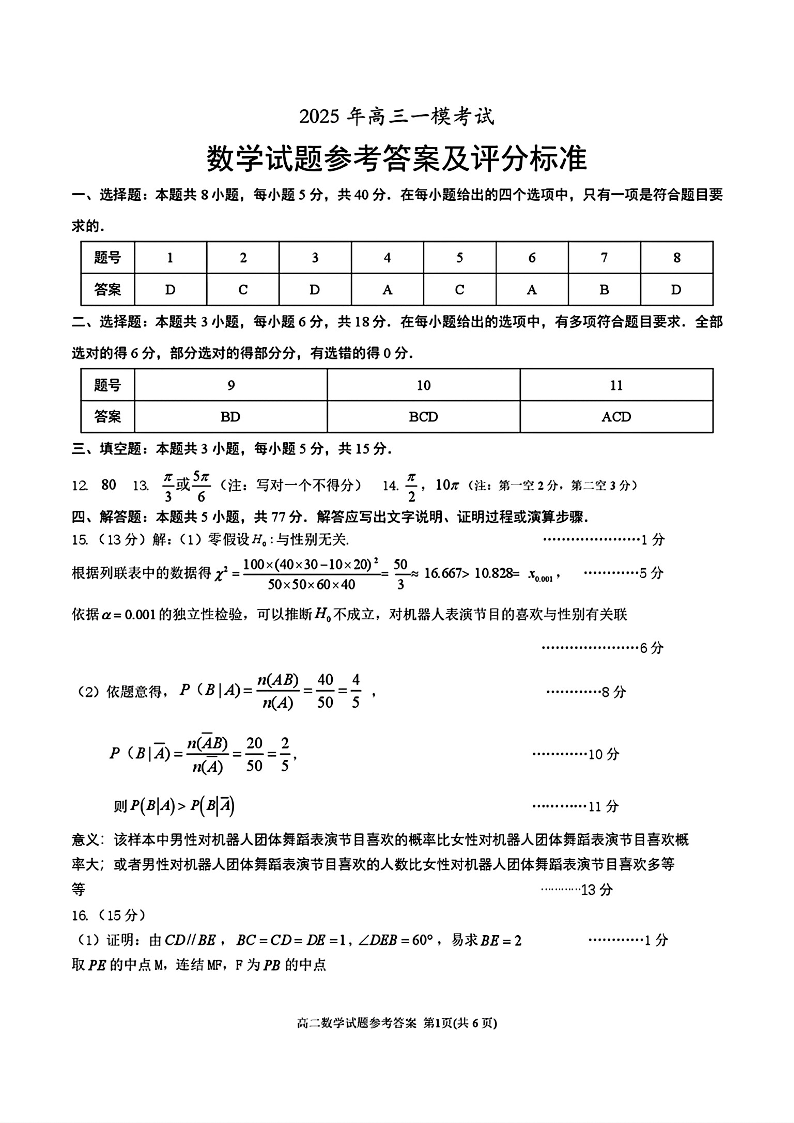 山东省菏泽市2025年高三一模考试 数学答案.pdf