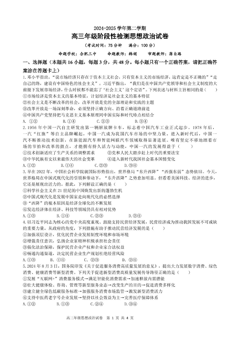 安徽省合肥市普通高中六校联盟2025届高三年级阶段性检测 政治.pdf
