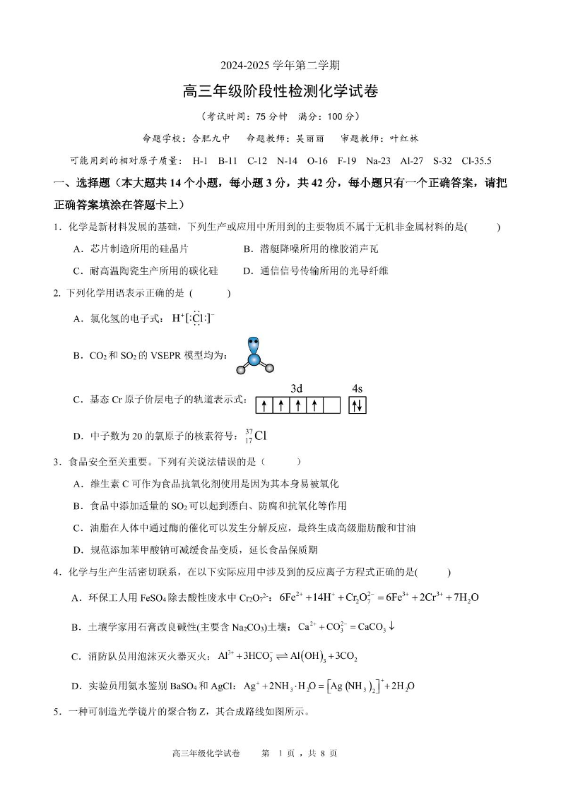 安徽省合肥市普通高中六校联盟2025届高三年级阶段性检测 化学.pdf