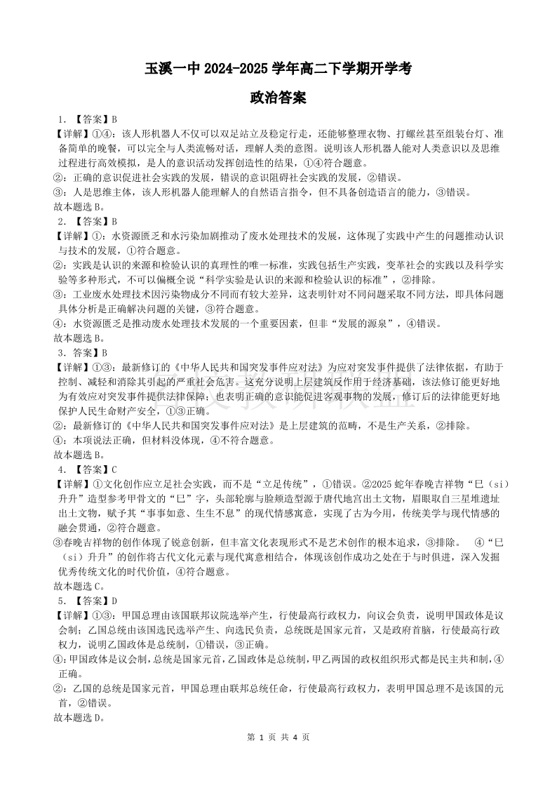 玉溪一中2024-2025学年高二下学期开学考 政治答案.pdf