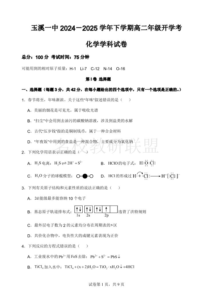 玉溪一中2024-2025学年高二下学期开学考 化学.pdf