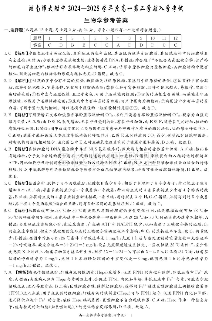 生物答案(附中高一入学2期).pdf