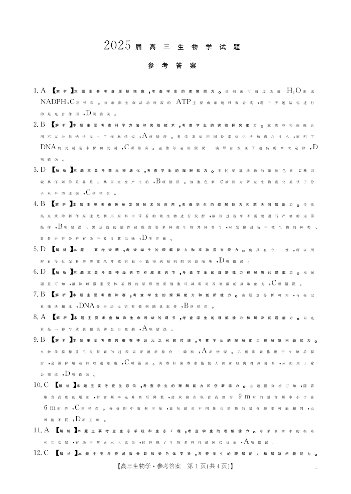 四川省雅安中学2025届高三下学期2月入学考试 生物答案.pdf