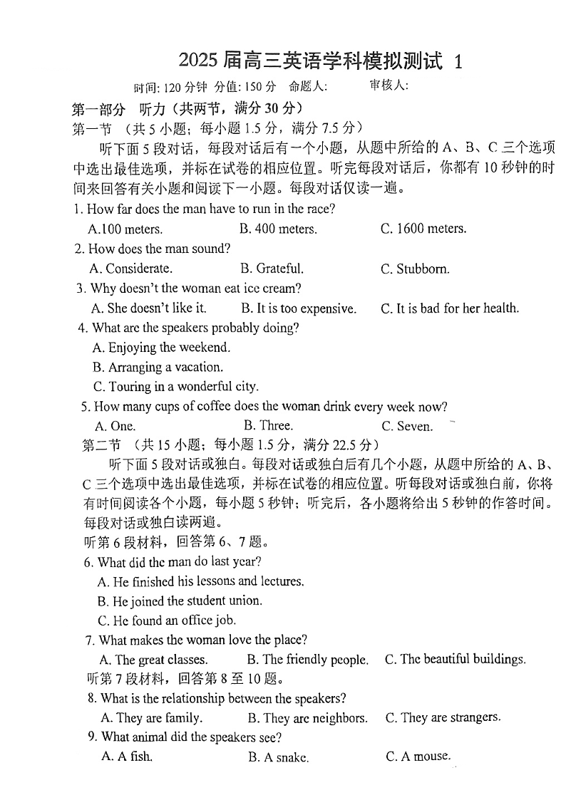 江苏省盐城市射阳中学2025届高三下学期模拟预测 英语(含答案).pdf