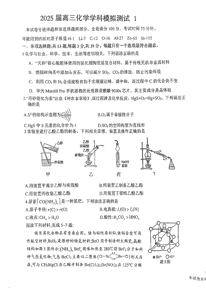 江苏省盐城市射阳中学2025届高三下学期模拟预测 化学(含答案).pdf