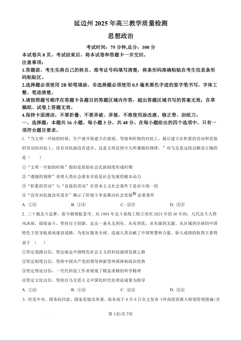 延边州2025年高三教学质量检测 政治.docx