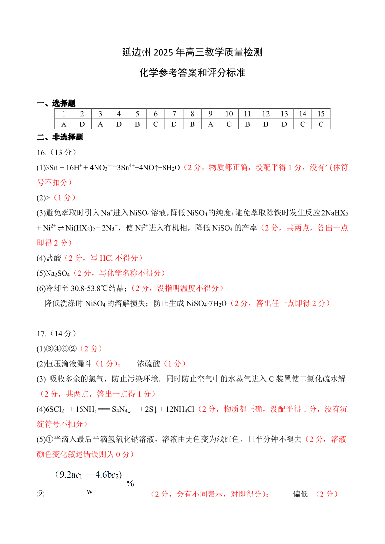 延边州2025年高三教学质量检测 化学答案.pdf