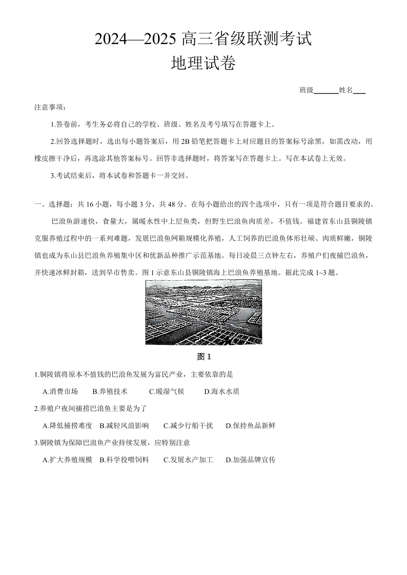河北省2024-2025学年高三下学期省级联测考试 地理(含答案).pdf