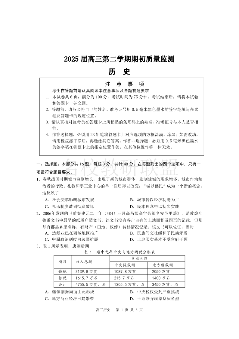 江苏省新高考基地学校2025届高三下学期期初质量监测 历史.pdf