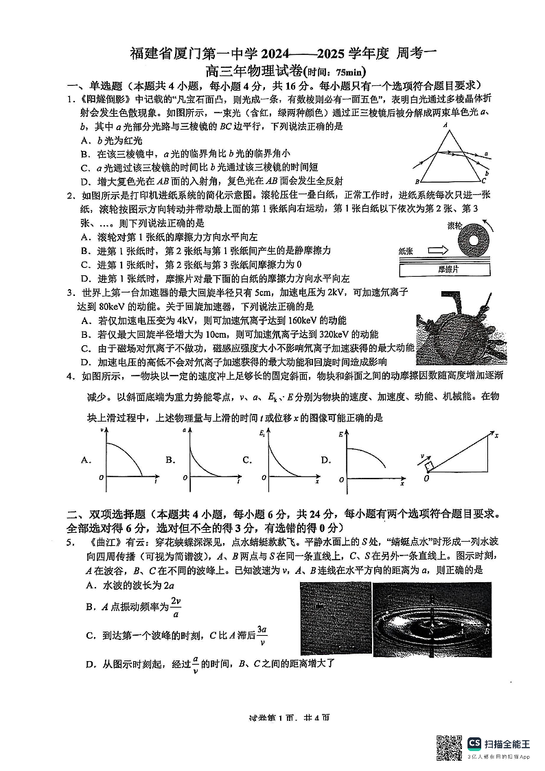 福建省厦门第一中学2025届高三下学期第一次周考 物理(含答案).pdf