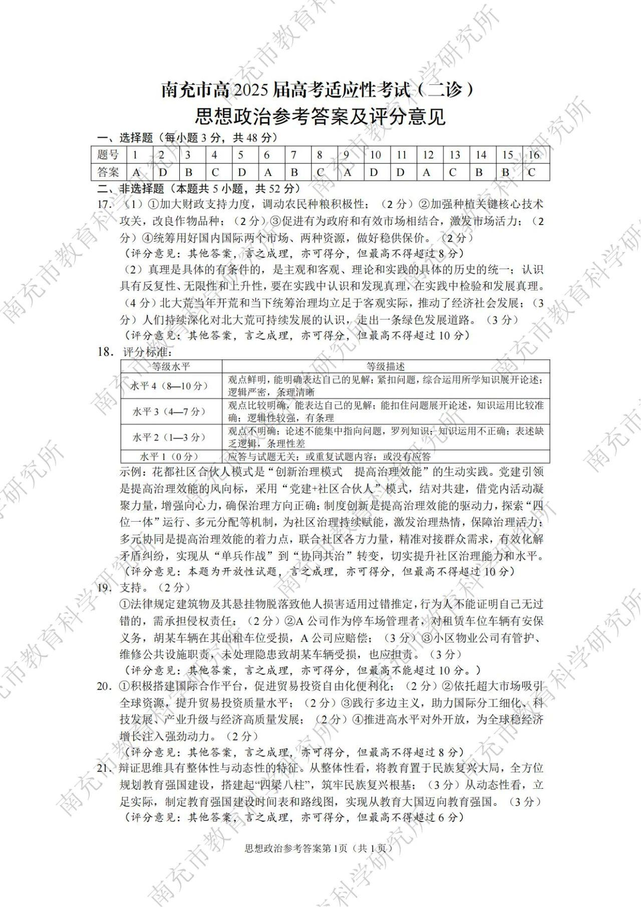 四川省南充市高2025届高考适应性考试(二诊)政治答案.pdf