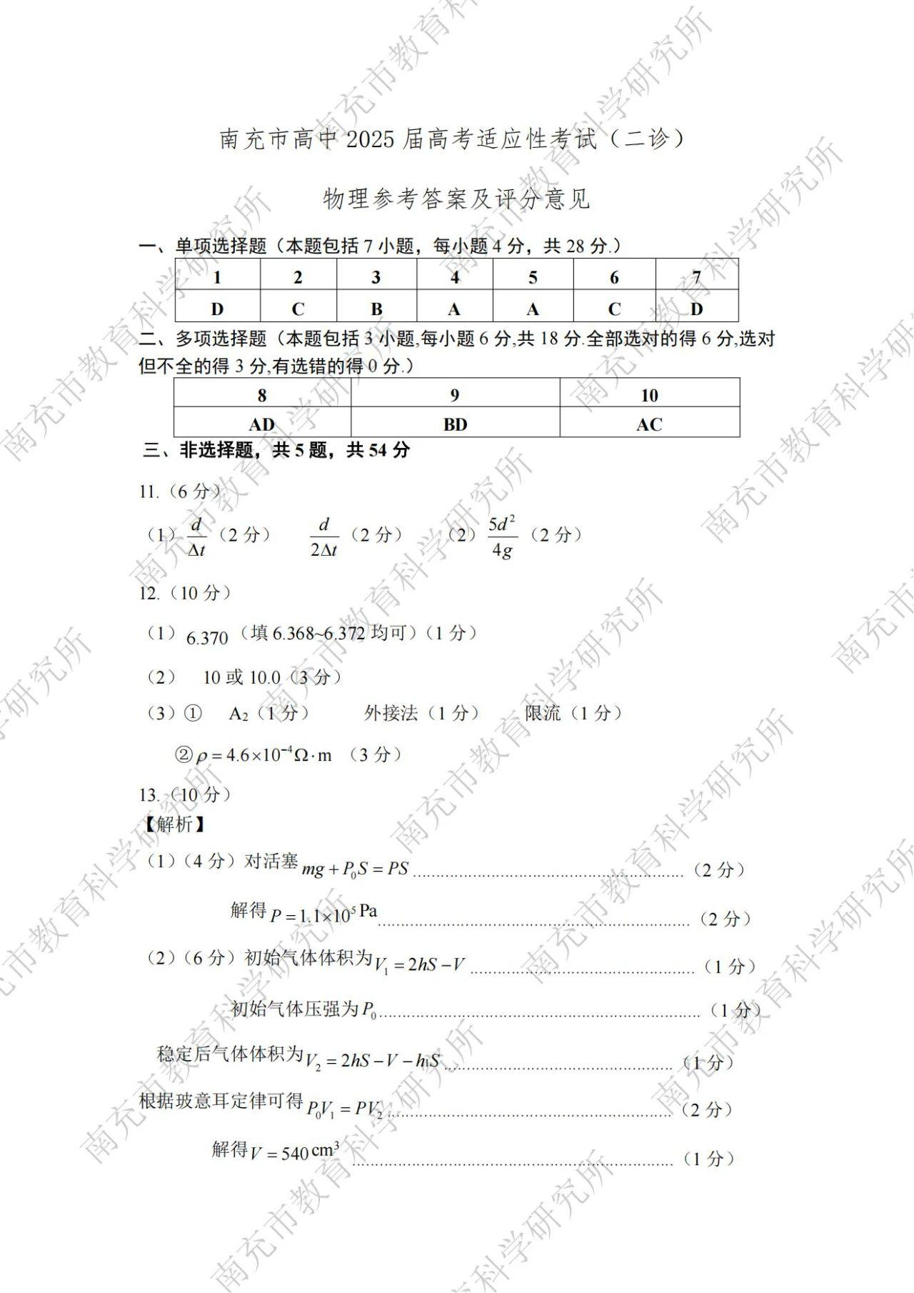 四川省南充市高2025届高考适应性考试(二诊)物理答案.pdf