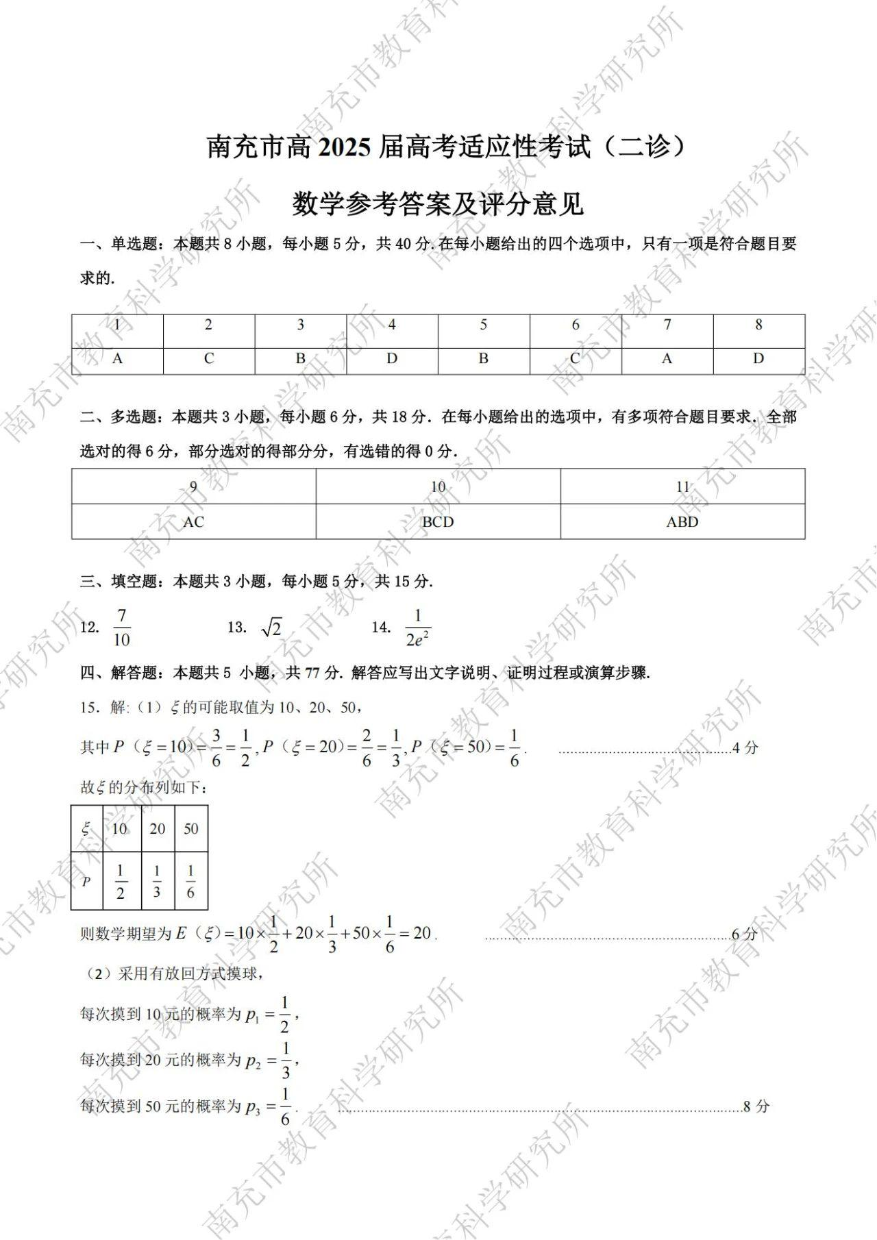四川省南充市高2025届高考适应性考试(二诊)数学答案.pdf