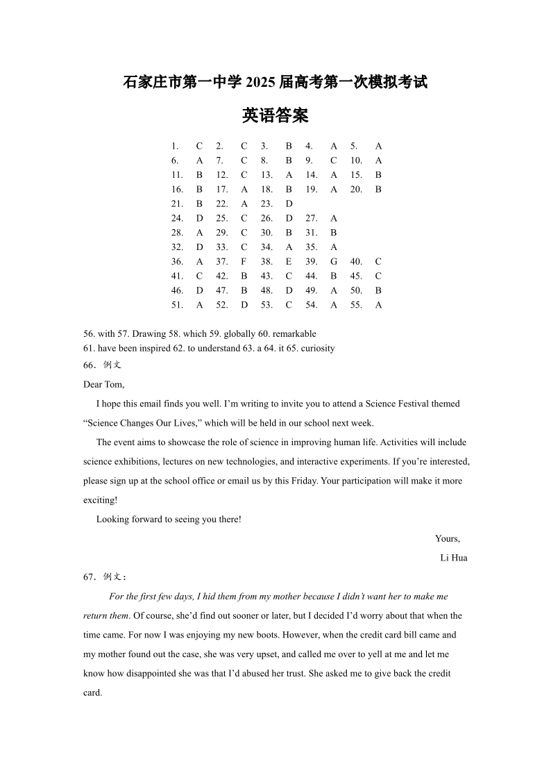 石家庄市第一中学2025届高考第一次模拟考试 英语答案.pdf