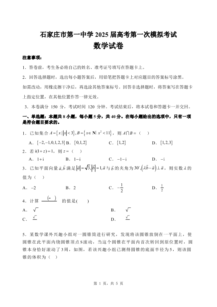 石家庄市第一中学2025届高考第一次模拟考试 数学.pdf