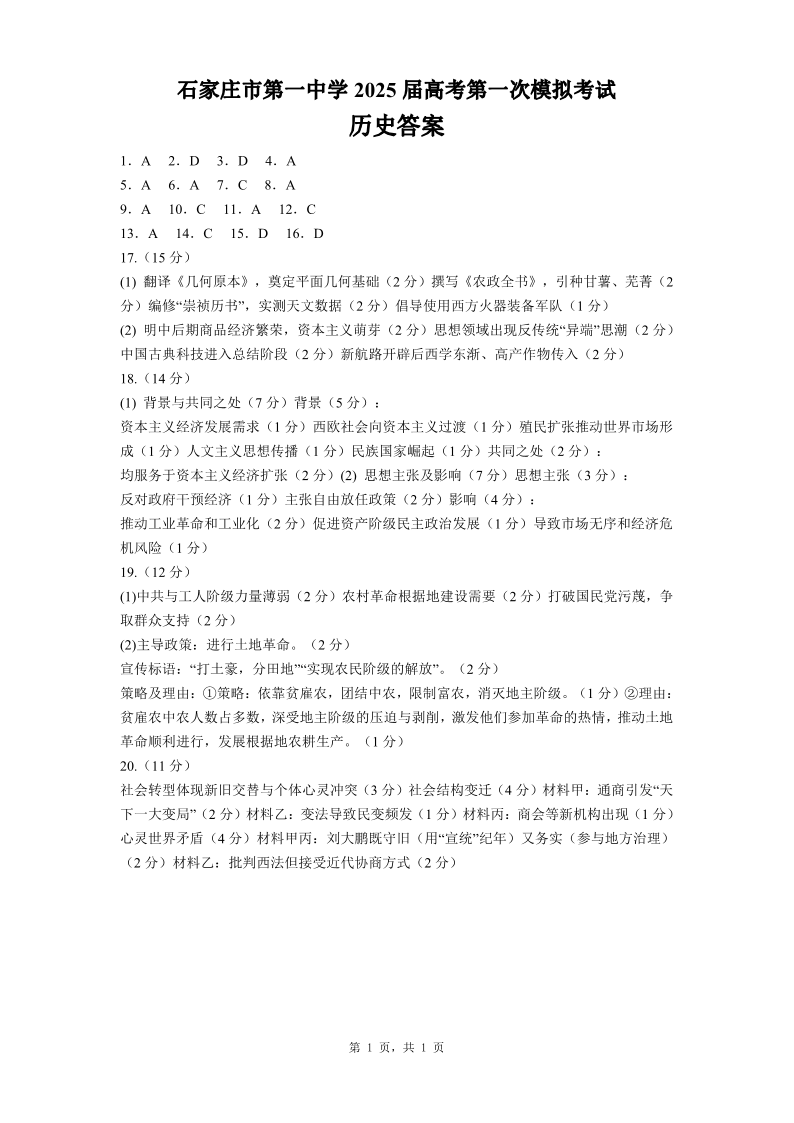石家庄市第一中学2025届高考第一次模拟考试 历史答案.pdf