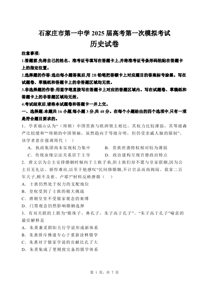 石家庄市第一中学2025届高考第一次模拟考试 历史.pdf